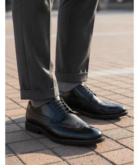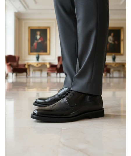 Derby de vestir color negro hecho de piel natural con suela de cuero y forro sintético que transpira y es anti-hongos y anti-bacterias. Tiene perforaciones a lo largo de la costura en la puntera para darle un toque clásico del estilo preppy.